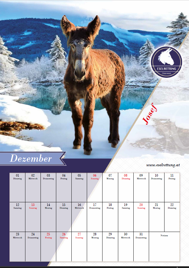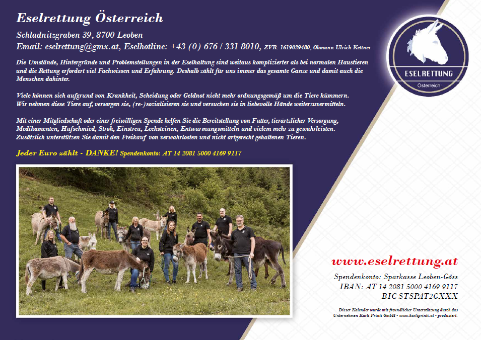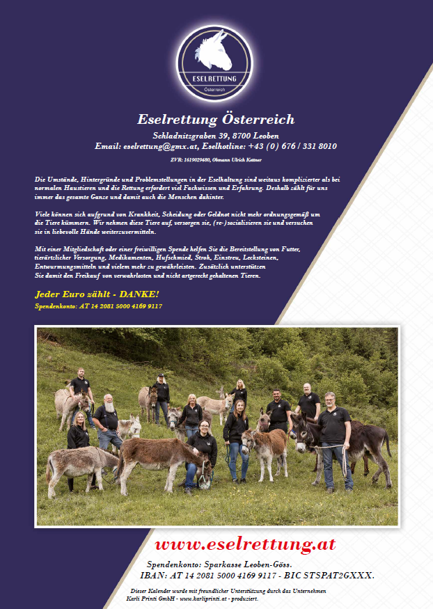 Die (neuen) Jahreskalender 2026 der Eselrettung Österreich, der von unserer Spitzen Druckerei www.karliprinti.at neu aufgebaut und gestaltet wurde.